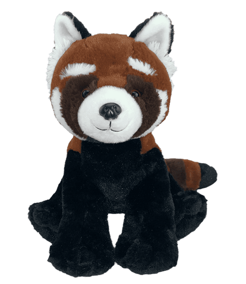 This plush Panda stuffed animal has reddish-brown fur with a dark black underbelly and bushy striped tail.