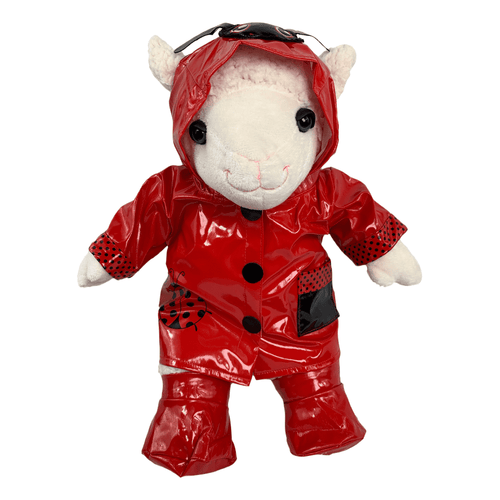 No more wet days for your furry friend! This soft and cuddly lambert the lamb dressed in this elegant red lady bug raincoat will protect your teddy bear on the rainy day!