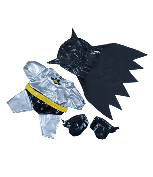Transform your teddy bear into a spooky superhero with this Bat Boy outfit. Complete with a black and yellow jumpsuit, mask, and cape!!